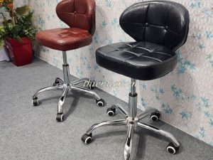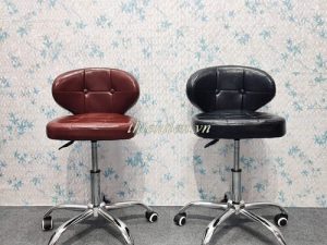 Ghế có piston lên xuống được. Châm mạ crom, có bánh xe nhựa di chuyển.