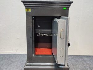 Thân két được cấu tạo = 2 lớp vỏ thép cao cấp + petong chống cháy. Cánh cửa chắc chắn; chốt nhao bằng thép.