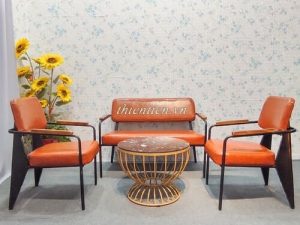 Phần tay vịn thanh mảnh kết hợp với tay gỗ thông trang trí thô mộc theo hướng Vintage, lưng tựa và mê ngồi bọc đệm simili hoặc vãi bố màu sắc đa dạng.